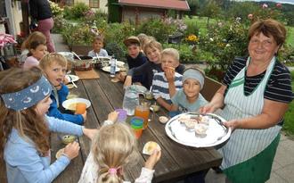 Nach getaner Arbeit in der Küche von Christl Stefanutti (rechts) ließen sich die Kinder beim Kinderferienprogramm „Der Apfel – eine runde Sache“ des BBV-Ortsverbandes Grabenstätt-Erlstätt ihre Apfelsuppe, Apfelmuffins, Apfelkircherl und Apfelmus schmecken. Für viele Kinder dürfte es die erste Apfelsuppe ihres Lebens gewesen sein. Die Äpfel verliehen der Suppe durch den Fruchtzucker einen süßlichen Geschmack.