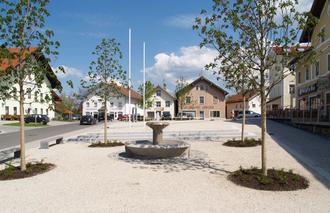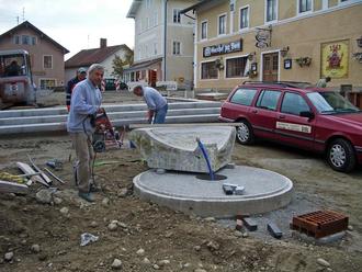 Im Rahmen der Marktplatzsanierung musste der Dorfbrunnen abgebaut werden. Hier sieht man Hans Peter Sigl und seinen langjährigen Mitarbeiter Rudi Hofmann beim Wiederaufbau im Jahr 2007 am neuen Standort.