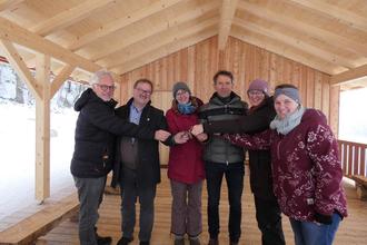 Der Waldkindergarten am Eichbergwald südlich von Grabenstätt ist Mitte Januar seiner Bestimmung übergeben worden. Zur symbolischen Schlüsselübergabe fanden sich neben den sechs (von aktuell sieben) Waldkindergartenkindern, deren Betreuerinnen Hilde Gulich und Heidi Lukas (Dennis Bielz fehlte) und Kindergartenleiterin Anna Bauer unter anderem auch Bürgermeister Gerhard Wirnshofer, die gemeindliche Kämmerin Kerstin Seidel, der Kindergartenverwaltungsleiter Maximilian Wimmer und Kirchenpfleger Josef Austermayer ein. „Gefällt‘s euch im Wald?“, wandte sich Wirnshofer an die Kinder und sogleich schallte ihm zur Freude aller ein lautes „Ja“ entgegen. Im nahen Eichbergwald hatten es sich die „Pfifferlinge“ in den vergangenen Monaten bereits heimelig eingerichtet. So entstanden etwa ein Morgenkreisplatz und eine „Matschküche“. Untergebracht waren sie seit Beginn des laufenden Kindergartenjahres in der dafür extra ertüchtigten Stockschützenhütte des TSV Grabenstätt. Von dort aus konnten sie mit ihren Betreuern die Baufortschritte bei „ihrer“ hölzernen Waldkindergarten-Schutzhütte mit Aufenthaltsraum und überdachter Freifläche bestens beobachten, was die Vorfreude immer größer werden ließ. In Zukunft könnten in dem einladenden Gebäude bis zu 25 Kinder betreut werden. Für eine entsprechende Gruppengröße ist der Bedarf angemeldet worden. Im Juli war bekanntgeworden, dass die katholische Kirchenstiftung St. Maximilian Grabenstätt nun doch die Trägerschaft übernehmen kann. Die dafür notwendige Zustimmung des erzbischöflichen Ordinariats hatte so lange auf sich warten lassen, dass die Gemeinde zwischenzeitlich ihre Bereitschaft erklärt hatte, als Träger einzuspringen, um das förderfähige Bauprojekt nicht zu gefährden. Man sei sehr froh darüber, dass sich die Trägerfrage doch noch wie gewünscht regeln habe lassen, so der 1. Bürgermeister.