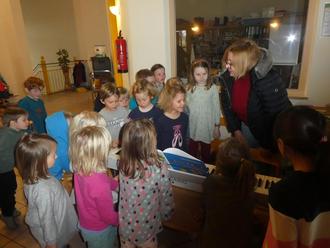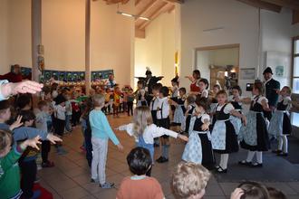 Zuerst besuchte uns die Grabenstätter Kinder-Trachtengruppe unter der Leitung von Sabine Fleischmann und ihren Jugendleitern Christine Lukas, Hansi Steffanutti und Hans Purzeller. Es wurden uns Tänze, Plattler und Spiele vorgeführt und unsere Kinder durften fleißig mitmachen. Eine großartige Aktion und am liebsten hätten wir diese schneidige Gruppe mindestens einmal in der Woche bei uns im Haus. Doch das geht leider nicht, und so werden wohl unsere Kindergartenkinder am Nachmittag in die Trachtenprobe nach Grabenstätt gehen.