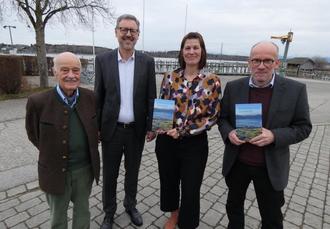 Sie sind die Herausgeber des frisch erschienenen archäologischen Führers der Römerregion Chiemsee: der provinzialrömische Archäologe von der Archäologischen Staatssammlung München Dr. Bernd Steidl (Zweiter von links), die heimische provinzialrömische Archäologin Andrea Krammer und der renommierte deutsche provinzialrömische Archäologe und Schirmherr der Römerregion Prof. Dr. Siegmar von Schnurbein (links). Mit Volker Babucke (rechts) vom Likias Verlag freuten sie sich bei der Buchpräsentation in Seebruck über das gelungene Werk, an dem 15 weitere Autoren beteiligt waren. Auf rund 150 Seiten werden 33 historische Stationen, die im Rahmen des Projekts Römerregion Chiemsee in elf Gemeinden entstanden, fachkundig und anschaulich beleuchtet.