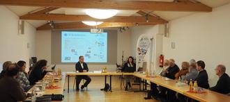 Bürgermeister Gerhard Wirnshofer (vorne links) begrüßte im Saal der Schlossökonomie in Grabenstätt das Akteursnetzwerk der „Römerregion Chiemsee“. Andrea Krammer von der Koordinationsstelle der Römerregion Chiemsee (vorne rechts) informierte über die Aktivitäten des letzten Jahres und die Planungen für 2023 im Rahmen des alljährlichen Informations- und Abstimmungstreffens. Foto: Marion Tippmann-Böge