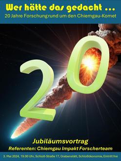'Chiemgau-Impakt' bezeichnet den Einschlag eines Kometen/Planetoiden und die Erzeugung eines großen Meteoritenkraterstreufeldes in Südostbayern vor ca. 3000 Jahren. Die Forschungsergebnisse unter Einbezug einer großen Zahl verschiedener Wissenschaften und unter Einsatz von Hightech-Geräten belegen im Gebiet zwischen Altötting, dem Chiemsee und dem Alpenrand eine erhebliche lokale und regionale Katastrophe. Der Einschlag hat wohl auch überregionale Wirkungen hervorgerufen. Menschen waren Augenzeugen des faszinierenden, schockierenden und verstörenden Ereignisses. Was haben die nationalen und internationalen Forscher in den letzten 20 Jahren Faszinierendes, Spannendes und Ungewöhnliches entdeckt? Der öffentliche Vortrag bietet in verständlicher Form eine Zusammenfassung der Funde aus 20 Jahren Forschung.