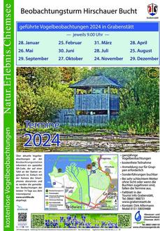 Ganzjährig finden immer am letzten Sonntag des Monats ab 9:00 Uhr am Beobachtungsturm Hirschauer Bucht geführte kostenlose Vogelbeobachtungen statt – bitte weisen Sie auch Ihre Gäste auf dieses interessante Angebot hin! Eine Anmeldung ist nur für Gruppen erforderlich. Detailliertere Informationen zu den Naturführungen rund um den Chiemsee erhalten Sie in der Tourist-Information.
