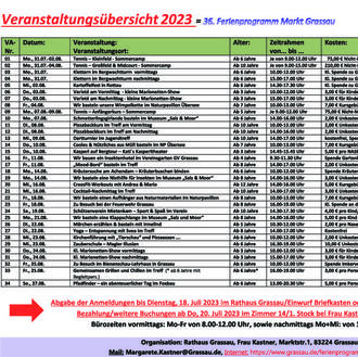 Veranstaltungsübersicht und Anmeldung zum Ferienprogramm 2023 siehe Seite