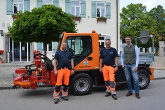 Ein kleines Kraftpaket mit vielen Einsatzmöglichkeiten, ideal für Pflegearbeiten des Bauhofs, konnte nun mit dem Ladog Schmalspurfahrzeug in den Dienst gestellt werden. Bauhofleiter Michael Höger mit stellvertretendem Leiter Florian Hofmann zeigten Bürgermeister Stefan Kattari das neue Bauhoffahrzeug. Wie bei einem Baukasten wurde das neue Kommunalfahrzeug auf die Bedürfnisse des Bauhofs zugeschnitten, informierte Höger. So könne dieses auf den Gehwegen fahren. Die Fahrerkabine des 115 PS starken Gefährts mit Höchstgeschwindigkeit von 60 Km/h bietet eine sehr gute Rundumsicht, was bei Mäharbeiten und beim Winterdienst sehr von Vorteil ist. Eine Zuladung auf der Ladefläche von 2,5 Tonnen ist möglich. Damit können die Bauhofmitarbeiter auch Wanderwege neu aufkiesen. Die Kippfunktion erleichtere zudem die Arbeit. Vielseitige Einsatzmöglichkeiten bietet dieses allradbetriebene Fahrzeug im Wert von über 160.000 Euro. Beim Wegebau, aber auch durch die Aufsatzmöglichkeiten und Hydraulik kann ein Böschungsmähwerk zum Einsatz gebracht werden. Mit einer großen Schaufel ausgestattet, dient es im Winter dem Schneeräumen und im Sommer kann zudem auf der Ladefläche der große Wassercontainer transportiert werden, um die vielen Blühflächen in der Gemeinde zu bewässern. Der Allrounder besitzt viele Einsatzmöglichkeiten. „Wir sind stolz auf unseren Bauhof und die Mitarbeiter leisten viel, da ist es selbstverständlich, dass sie mit gutem Gerät ausgestattet werden“, sagte Bürgermeister Kattari voll des Lobes. Er verwies darauf, dass der Ladog, das bis dato im Betrieb gewesene Schmalspurfahrzeug ersetzt. Dieses war über zehn Jahre im Einsatz. Der Bauhof ist für die vielen Blühflächen, für die Gestaltung der Kreisverkehre, der Pflanzentröge, des Kurparks, der Spielplätze und des Reifinger See, sowie der Pflege der Geh- und Wanderwege, um nur einige Aufgabenfelder zu nennen, verantwortlich und kann zurecht stolz auf seine Arbeit sein. Wie schnell gearbeitet wird, zeigt sich auch immer nach dem Leonhardi-Ritt. Einen Kehraufsatz hat das neue Kommunalfahrzeug ebenfalls. tb