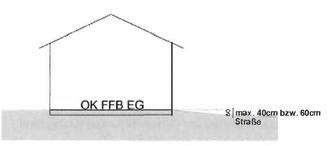 | 2. | Die Oberkante des Fertigfußbodens des Erdgeschosses (OK.FFB.EG) darf in der Gemarkung Rottau maximal 40 cm und in der Gemarkung Grassau maximal 60 cm über dem, an das Grundstück angrenzende Straßenniveau (Straßenkante) liegen. Ausschlaggebend ist die dem Baugrundstück zugewandte Verkehrsfläche. |