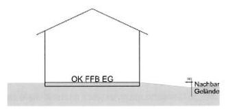 | Weist die Straße ein Gefälle auf, ist Bezugspunkt die Straßenkante im Bereich der geplanten Zufahrt (mittig der Zufahrt) zum geplanten Gebäude. | |