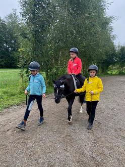 Anschließend ging es auf den Reitplatz. Dort konnten die Kinder ihre ersten Reiterfahrungen auf dem Rücken der braven Ponys machen.