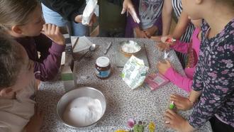 Der Kurs startete mit einer entspannenden Gesichtsmassage, bei der sich immer zwei gegenseitig verwöhnten. Die Massagepunkte eignen sich auch hervorragend, um leichtes Kopfweh zu lindern. Großen Spaß machte allen die Quark-Gurken-Gesichtspackung, die an heißen Tagen der sonnenstrapazierten Haut besonders gut tat. Abschließend wurde für die kommende kalte Jahreszeit noch ein duftender Badezusatz hergestellt. Viele Zutaten brauchte es dazu nicht, nur Kaisernatron, Stärke, Kokosfett und ein paar Düfte oder getrocknete Kräuter. Die Zeit verging wie im Flug und alle hatten ihre Freude daran.