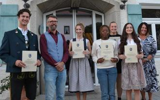 v.l. Ausgezeichnet wurden Leonhard Fuchs von Bürgermeister Stefan Kattari sowie Maria Pletschacher, Maranata Mabenga Mwanza, Lisa Müller, Anna Tanjic. Marina Pfaffinger, im Rathaus zuständig für Schulen und Schüler gratulierte ebenfalls.