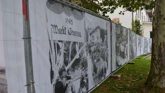 Der Bauzaun rund um Musikschule und Grundschule ist mit Bildern bestückt, die das Markterhebungsfest von 1965 dokumentieren. Über 30 großformatige Fotos zieren diese ungewöhnliche Galerie.