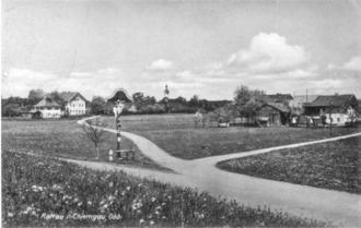 1940 Rottau mit Pestsäule und Feldkreuz. Im Hintergrund Schule und Kirche