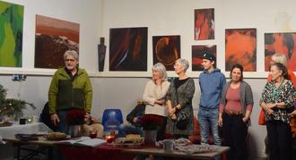 Imposant anzusehen, waren die vielen ausgestellten, meist abstrakten Bilder, die vor allem im Spätherbst bei einem Workshop mit dem professionellen Künstler Gerhard Almbauer gefertigt wurden. Eindrucksvoll an sich ist bereits das Atelier, untergebracht in den Scheddach Hallen, das sich der Kunstkreis nach seinem Geschmack eingerichtet hat. „Wir sind so oft als möglich hier“, erklärte Helmut Bielenski. „Wir sind alles keine Profis, haben aber Lust am Malen, Lust am Austausch“. Die Idee für einen Workshop in abstrakter Malerei hatte Bärbel Straub und so wurde Gerhard Almbauer engagiert. Dieser unterrichtete drei Tage lang, zeigte Techniken wie abstrakte Malerei funktionieren kann. Zehn Teilnehmer ließen sich vom Profi instruieren, der unter anderem Schütttechnik und Wischtechnik zeigte und betonte, dass „Farbe Form braucht“ und erklärte, wie geschickt mit Farbe hantiert werden kann, um Tiefe zu erreichten. „So kann man mit den Augen Spazierengehen“, sagte Helmut Bielenski. Die vielen Besucher zeigten sich erstaunt über die ausgestellten Werke, die sich in Farbe, Format und Wirkung unterschieden. Einige wirkten dreidimensional. Bei Weihnachtsmusik, Punsch und Plätzchen hatten die Besucher die Gelegenheit sich mit den Künstlern zu unterhalten und diese zu motivieren, weiterhin künstlerisch aktiv zu bleiben. Tb