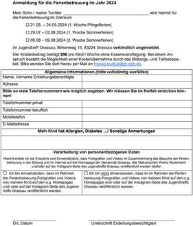 Das Angebot kann nur bei einer Mindestteilnehmerzahl von 12 Kindern bis zur Anmeldefrist stattfinden.