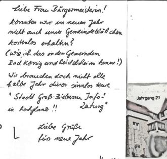 Text: „Liebe Frau Bürgermeisterin, könnten wir im neuen Jahr nicht auch unser Gemeindeblättchen kostenlos erhalten? (wie ich das in den Gemeinden Bad König und Reichelsheim kenne). Wir brauchen doch nicht alle halbe Jahr dieses sinnlos teure „Stadt Groß-Bieberau Info Zeitung“ in hochglanz!. Liebe Grüße für´s neue Jahr“