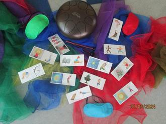 Material für Yoga: z.B. rundes Klanginstrument, Übungskarten, Tücher und Augenmasken