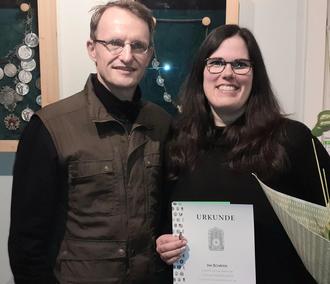 R. Weiß überreicht Urkunde, Ehren-Nadel und ein Blumengebinde an Ina Schäfer!