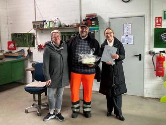 Seit 1999 verstärkt Herr Matthias Brockfeld bereits unser Team im städtischen Bau- und Betriebshof und trägt mit seiner Tätigkeit in der Grünflächenpflege maßgeblich für ein gepflegtes Erscheinungsbild unserer Stadt bei. Aus Anlass seines 25-jährigen Dienstjubiläums freuten sich Frau Bürgermeisterin Vogt und Frau Eichel vom Personalrat, ihm mit einer Urkunde und einem Präsent gratulieren und sich für seinen Einsatz bedanken zu können.