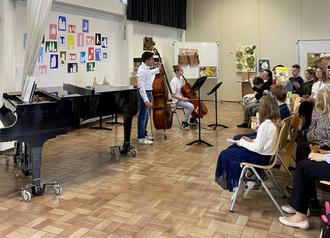 Anschließend spielte János Gal-Szász (Kontrabass) begleitet von Katrin Villemos (Klavier) einen Basse Dance mit Leichtigkeit. Weiter ging es mit einem Kontrabassduett (Dido und Aeneas) von Lion Heckelmann und Stephan Loew, bevor Solenn Wasem mit zwei Stücken am Klavier ihr Können zeigte. Mit Robin Timmermann (Kontrabass – ebenfalls im Duett mit Stephan Loew) spielte auch ein ehemaliger Schüler an diesem Abend – Menuett in G-Dur. Den beschwingten Abschluss des musikalischen Programms bildeten Joris Bauer (Cello) und János Gal-Szász (Kontrabass) mit einem Arrangement des Seashanty Wellerman.