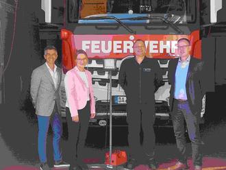 Auf dem Bild v.l.n.r. Ramon Moral, stellvertretender Vorstandsvorsitzender der Sparkasse Dieburg, Bürgermeisterin Anja Vogt, Stadtbrandinspektor Mike Bickelhaupt, Heiko Schulz, Abteilungsleiter Versicherung der Sparkasse Dieburg.