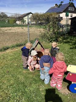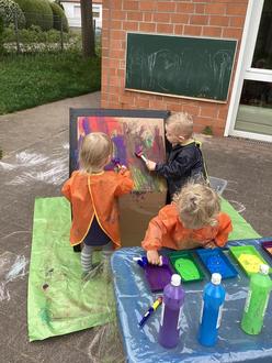 Die Kinder der Kater-Leo Gruppe bemalen ein selbst gebasteltes Haus aus Pappkarton. Mit Pinsel, Rolle und Schwämmchen wurde das Haus kunterbunt. Darin lässt sich super verstecken und spielen.