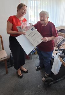 Am letzten Montag konnte Frau Elfriede Jährling ihren 96. Geburtstag feiern und Frau Bürgermeisterin Vogt freute sich, dem rüstigen Geburtstagskind persönlich gratulieren zu können. Bei dieser Gelegenheit konnte sie, neben einem kleinen Präsent, auch die Glückwunschurkunde des Magistrats überreichen, die ihren Platz an der „Urkundenwand“ von Frau Jährling finden wird.