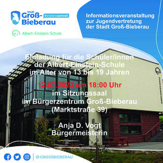 Die Stadt Groß-Bieberau möchte eine Jugendvertretung gründen und lädt alle Jugendlichen mit Hauptwohnsitz in Groß-Bieberau und alle nicht in Groß-Bieberau wohnhaften Schüler/innen der Albert-Einstein-Schule im Alter von 13 bis 19 Jahren zu einer Informationsveranstaltung ein.