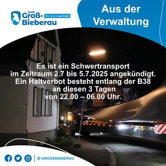 Es ist ein Schwertransport im Zeitraum 2.7. bis 5.7.2025 angekündigt.