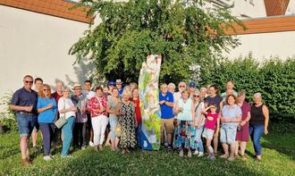 Zum Sektempfang trafen sich alle an der Bieberauer Skulptur von Simon Lortz, die ihren Platz auf der Grünfläche hinter „Merhaba“ gefunden hat.
