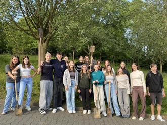 Wie verewigt man sich mit einer positiven Sache auf dem Schulgelände? Die Schüler der E02 haben dies in ihrer letzten Biologiestunde gemacht und gemeinsam ganz flott Blumenzwiebeln für das Frühjahr auf der Wiese oberhalb der großen Sporthalle gesetzt. Das nasse Wetter machte dies möglich, da sonst um diese Jahreszeit der Bieberauer Boden an dieser Stelle normalerweise bretthart ist und kaum ein Spatenstich möglich.