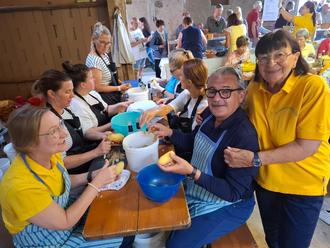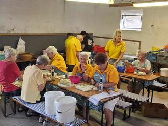 Nach der Begrüßung durch Bürgermeisterin Anja Vogt konnte das Fest mit dem Genuss der vielfältigen Köstlichkeiten starten. Gemeinsam mit Herrn Landrat Schellhaas und Herrn MdL Peter Franz unterstützte Frau Bürgermeisterin Vogt die engagierten Landfrauen beim Kartoffelschälen. Über 20 Frauen saßen in zwei Reihen an einem langen Tisch in der Scheune, ihre Hände arbeiteten emsig. Parallel dazu bereitete ein Team um Jürgen Albrecht die restlichen Zutaten für das leckere Essen vor. Das Kuchenbuffet war reich gefüllt, und dazu gab es köstlichen Kaffee – ein wahrer Genuss!