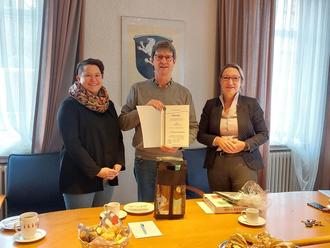 Auf dem Bild v.l.n.r., Personalrätin Elena Kowarsch, Jubilar Jürgen Loos, Bürgermeisterin Anja Vogt