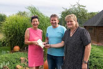 Das Bild zeigt die Spendenübergabe im Garten der Familie Trumpfheller. Von links: Sabine Gulatz (1.Vorsitzende), Sven Trumpfheller, Michaela Trumpfheller.
