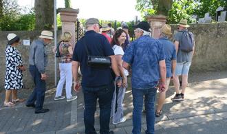 Schluss- und Höhepunkt der Führung war schließlich der jüdische Friedhof am Schaubacher Berg, der unter Denkmalschutz steht und von der Gemeinde Groß-Bieberau gepflegt wird. (Bild 2) Einige Personen aus den zuvor gehörten Geschichten konnten auf den Grabmalen wiedergefunden werden, was der Gruppe sofort einen persönlichen Bezug vermittelte. Auf einer von Georg Krell erstellten Übersicht konnten die Besucher die Namen und Familienzugehörigkeiten der in Bieberau bestatteten Juden nachlesen. Frau Grimm vermittelte noch einige Details zu den jüdischen Bestattungsbräuchen und die Gruppe erhielt die Gelegenheit, Fragen zu stellen.