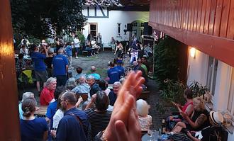Die sehr mutige Entscheidung des Kulturvereins, das Konzert im Hof der Kulturschmiede stattfinden zu lassen, hat sich ausgezahlt: der Abend wurde zu einem vollen Erfolg. Mehr als 120 Gäste besuchten das ernergiegeladene Konzert der überregional bekannten Band. Die Gäste strömten aus dem gesamten Umkreis in die Kulturschmiede und erlebten bei trockenen und angenehmem Wetter das optimale „Open Air“ Feeling. Die Band präsentierte ihr Programm mit größter Spielfreude und quatschte auch mal eine Runde direkt mit dem Publikum.