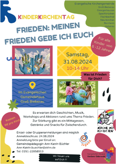 Am 31.8. findet von 10-14Uhr hier in Groß-Bieberau am Gemeindehaus der Dekanats Kinderkirchentag statt. Kinder im Alter von 6-12 Jahren bekommen für 6€ pro Kind Geschichten, Musik, Workshops und Aktionen rund ums Thema Frieden. Mittagessen, Getränke und Snacks sind inbegriffen.