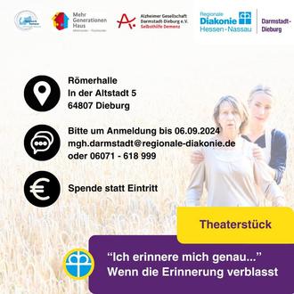 Im Rahmen der Woche der Demenz bietet die Regionale Diakonie Darmstadt-Dieburg in Kooperation mit dem Netzwerk Demenz Darmstadt-Dieburg, dem Mehrgenerationenhaus im Landkreis Darmstadt-Dieburg und der Alzheimer Gesellschaft Darmstadt-Dieburg zum Welt-Alzheimertag dieses Theaterstück an. Gleichzeitig wird das 16-jährige Bestehen des Demenzservicezentrums und das 6-jährige der Alzheimer Gesellschaft Darmstadt-Dieburg e.V. gewürdigt. Außerdem wird der Demenzwegweiser offiziell an den Landkreis übergeben.