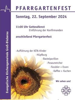 Wie üblich findet im Anschluss das Pfarrgartenfest statt. Es gibt Essen, Getränke und Kuchen und Beiträge von den Vorschulkindern der Evangelischen Kita und dem Evangelischen Posaunenchor. Auch das Team der Kinderkirche bietet wieder etwas an.