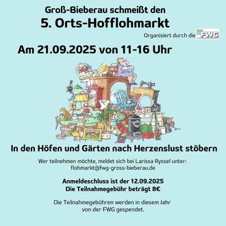 Am 21.09.2025 findet der 5. Groß-Bieberauer Hofflohmarkt statt, wie immer organisiert von der Freien Wählergemeinschaft (FWG) Groß-Bieberau. Anmeldungen sind nur noch bis 12.09. möglich.