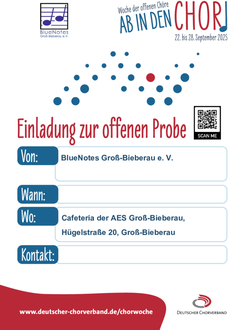 Im Rahmen der bundesweiten Woche der offenen Chöre 2025 des Deutschen Chorverbands laden die BlueNotes Groß-Bieberau zu einer offenen Chorprobe ein. Die Veranstaltung findet am Mittwoch, 24. September 2025, um 19:30 Uhr in der Cafeteria der AES Groß-Bieberau, Hügelstraße 20, statt.