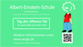 Am Samstag, 27. Januar 2024 öffnen sich erneut die Tore der AES, um sich den künftigen Fünftklässler:innen und Oberstufenschüler:innen sowie allen Interessierten vorzustellen und einen Einblick in das tägliche Schulleben zu geben. Die Begrüßung mit musikalischem Rahmenprogramm und Erläuterungen zum organisatorischen Ablauf findet um 10 Uhr in der Großsporthalle statt.