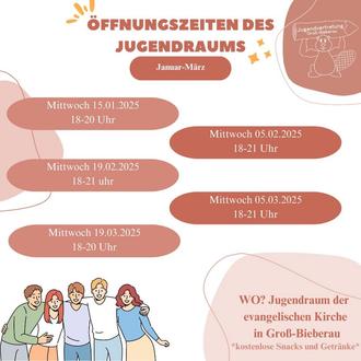 Wir freuen uns darauf, euch im Jugendraum willkommen zu heißen und gemeinsam tolle Erlebnisse zu schaffen! Bleibt gespannt auf die genauen Öffnungszeiten, die bald bekannt gegeben werden!
