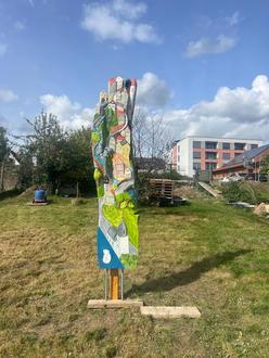 Der Höhepunkt des Nachmittags war die Enthüllung der Stadt- und Dorfentwicklungsskulptur des lokalen Künstlers und Holzbildhauermeisters Simon Lortz, ein Künstler unserer Stadt. Zuvor hatten Groß-Bieberauer Kinder die Gelegenheit, sich künstlerisch einzubringen. Hierzu wurden kleine Holzfiguren individuell bemalt und von Simon Lortz persönlich an der Skulptur angebracht. Dieses wunderschöne Kunstwerk wird nach Fertigstellung dauerhaft in der Ortsmitte zu sehen sein.