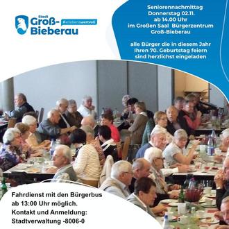 Nach drei Jahren Pause, können wir in diesem Herbst wieder unser traditioneller Seniorennachmittag stattfinden lassen. Wir freuen uns, Sie endlich wieder in geselliger Runde zu treffen. Der Magistrat der Stadt Groß-Bieberau lädt zum diesjährigen Seniorennachmittag alle Groß-Bieberauer, Rodauer und Hippelsbacher Bürgerinnen und Bürger, die in diesem Jahr ihren 70. Geburtstag feiern konnten und noch feiern werden, oder bereits älter sind, herzlich ein. Auch jüngere Ehe- oder Lebenspartner sind herzlich willkommen. Ein Fahrdienst wird wieder zur Verfügung stehen, der Sie, falls Sie es wünschen und in Ihrer Teilnahmebestätigung angekreuzt haben, gerne ab 13:00 Uhr zur Veranstaltungsstätte bringt und nach Veranstaltungsende wieder nach Hause fährt. Ihre Teilnahme wollen Sie uns bitte mittels der im Groß-Bieberauer Anzeigeblatt abgedruckten Teilnahmebestätigung, oder telefonisch unter der Rufnummer 06162-8006-0, bis spätestens 18. Oktober 2023, bekannt geben.