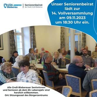 Einladung zur 14. Vollversammlung der Groß-Bieberauer Seniorinnen und Senioren (ab dem 63. Lebensjahr) am Donnerstag, 9. November 2023 - um 18.30 Uhr im Sitzungssaal des Bürgerzentrums