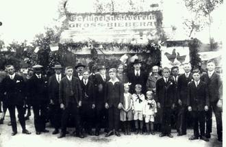 Die Aufnahme zeigt die Mitglieder des Geflügelzuchtvereins bei einem Festzug in den 1920er Jahren.