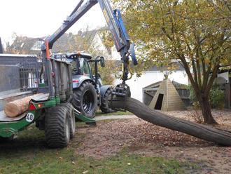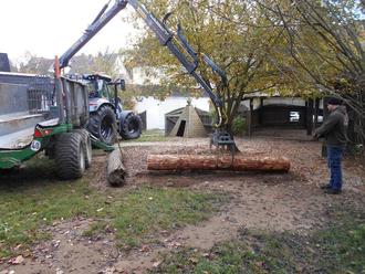 Die Firma Eichel-Forst hatte am Montag, 4.11.2024 den neuen Baumstamm mit Traktor und Kranwagen gebracht.