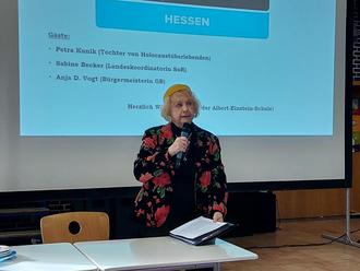 Die Frankfurterin schilderte ihre Erlebnisse aus ihrer Kindheit, die Berichte ihrer Eltern und ihr Leben als aktive Jüdin in der Frankfurter Gemeinde. Trotz der bedrückenden Leidensgeschichte ihrer Familie, über die sie auch während des Auschwitzprozesses 1963 selbst erfuhr, ist Frau Kunik sehr optimistisch und möchte mit ihren Zeitzeugen- und Dialogarbeiten Brücken der Verständigung schlagen und die Anerkennung für den fremden Anderen wecken.