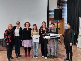 Frau Becker, Landeskoordinatorin des Bundesnetzwerkes, übergab in Anwesenheit aller Klassen- und Kurssprecherinnen und -sprecher, sowie den Abschlussklassen der Ober- und Mittelstufe, die Urkunde an die Schulsprecherinnen und Schulsprecher.